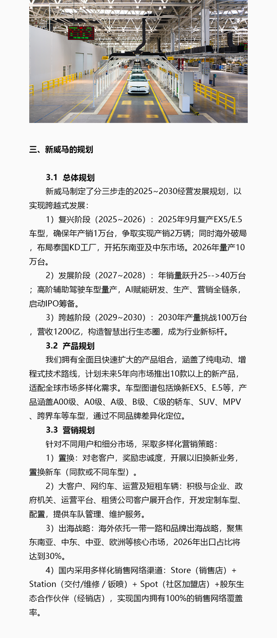 此外,威马汽车制定了2025年-2030年“三步走”发展规划。2025-2026年为复兴阶段,除9月复产EX5、E5车型并力争年产销2万辆外,还将布局泰国KD工厂开拓东南亚及中东市场,2026年实现10万台产量;2027-2028年进入发展阶段,年销量目标25万-40万台,量产高阶辅助驾驶车型并启动IPO筹备;2029-2030年冲刺跨越阶段,计划2030年产量100万辆、营收1200亿元,构建智慧出行生态圈。产品端未来5年将推出10款以上新产品,覆盖A00级至C级多品类车型。