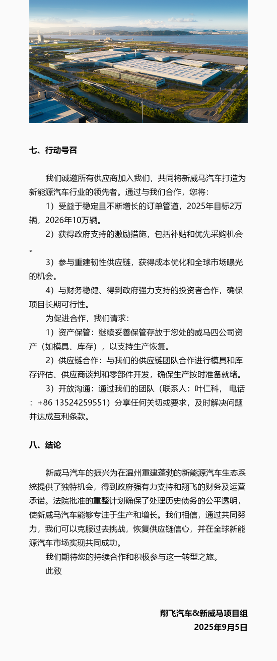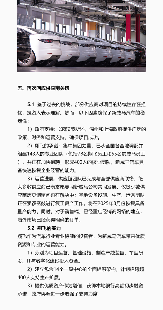 威马汽车重整投资人深圳翔飞汽车销售有限公司(简称“翔飞”)通过威马汽车官微发布《致供应商白皮书》,称计划于2025年9月在温州基地恢复EX5和E5车型的量产,同时宣布对供应商欠款的清偿计划。