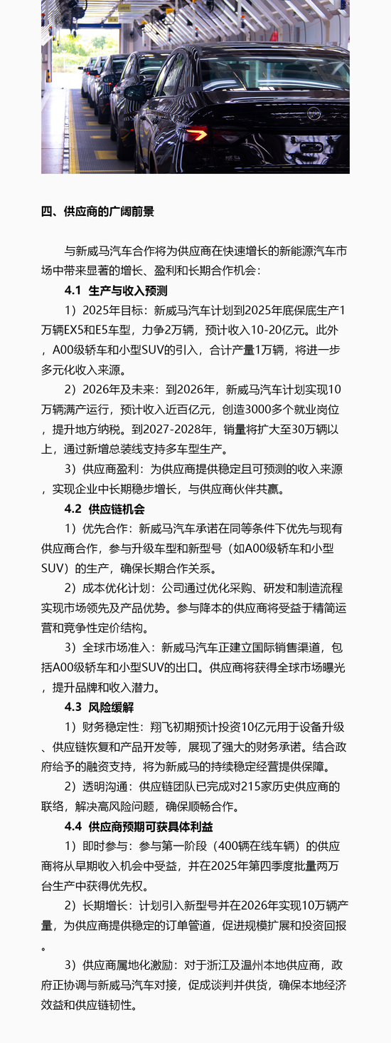 对于供应商合作,威马汽车2025年底保底生产1万辆EX5和E5车型,2026年实现10万辆满产。公司承诺同等条件下优先与现有供应商合作,推动其参与全球市场并共享成本优化成果,浙江及温州本地供应商还将获得政府协调对接支持。